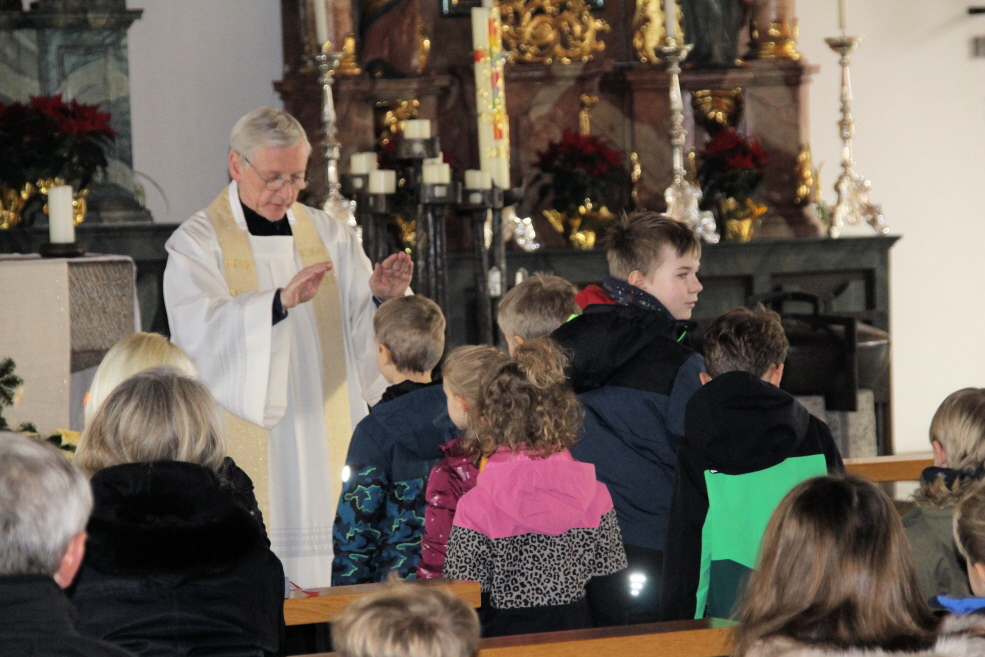 Pfarrer Norbert Große sagte, „schön dass ihr am ersten Tag des Jahres in die Kirche gekommen seid. An Weihnachten gibt es für die Kinder und Erwachsene viel zu sehen. Zuhause oder in der Kirche gibt es einen Weihnachtsbaum, Sterne oder auch ein Krippe“. Neben dem Altar war eine Leinwand aufgestellt an der ein Bild von Jesus mit Kindern zu sehen war. Der Geistliche erzählte dazu eine Geschichte über Jesus, der schon erwachsen war und viele Kinder zu ihm kamen. So wie die Kinder auf dem Bild zu Jesus kamen, so sollen auch heute die Kinder nach vorne kommen und Pfarrer Norbert Große hat sie einzeln gesegnet.